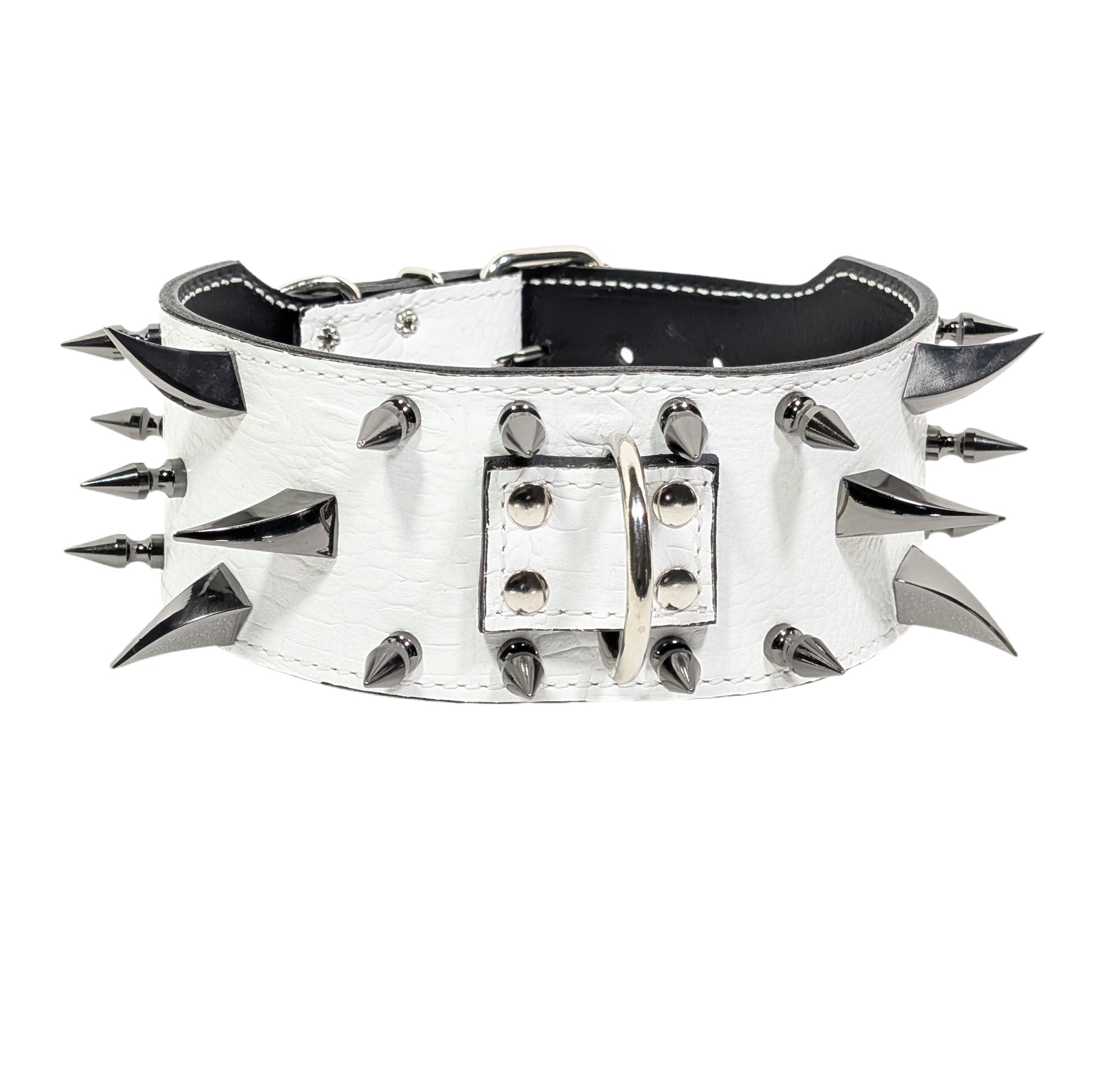 • 9-10 oz. Black full Grain Bridle Leather is the base of the Collar • Bonded Nylon Stitching • 3" Wide • Heavy Duty Roller Buckle • Welded D Ring for Leash attachment (optional Center D-Ring) • Metal Loop • Dragon Claws • 1” Tree Spikes