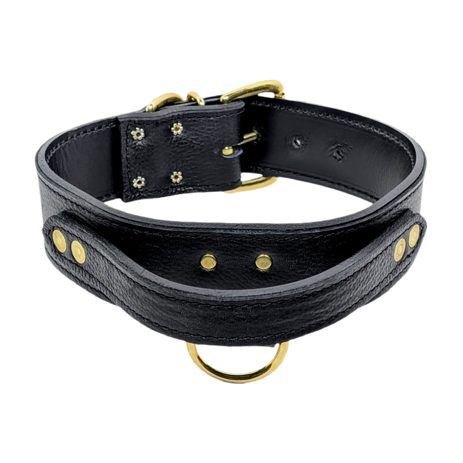 • 9-10 oz. Full Grain Bridle Leather is the base of the Collar • Bonded Nylon Stitching • 2" Wide • 1” Wide Leather Handle • Heavy Duty Roller Buckle • Welded D Ring for Leash attachment (optional Center D-Ring) • Metal Loop