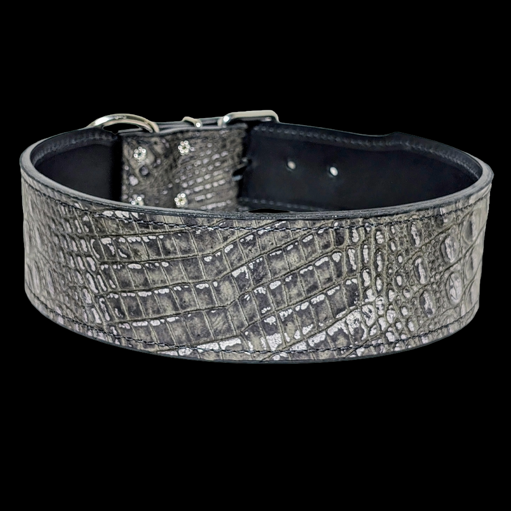 • 9-10 oz. Full Grain Bridle Leather is the base of the Collar • Magic Eclipse Croc Italian Leather • Bonded Nylon Stitching • 2.5" Wide • Roller Buckle • Metal Loop • Welded D Ring