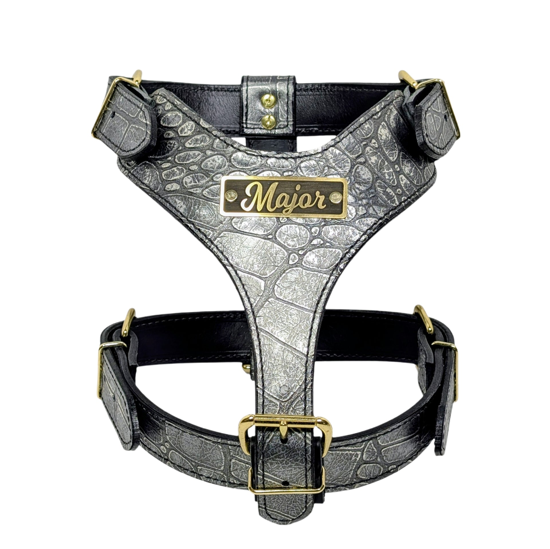 Arnês de couro para cães com placa de identificação. Belo visual limpo com sua escolha de cor de couro. Eles são totalmente ajustáveis ​​na área do peito e do pescoço.